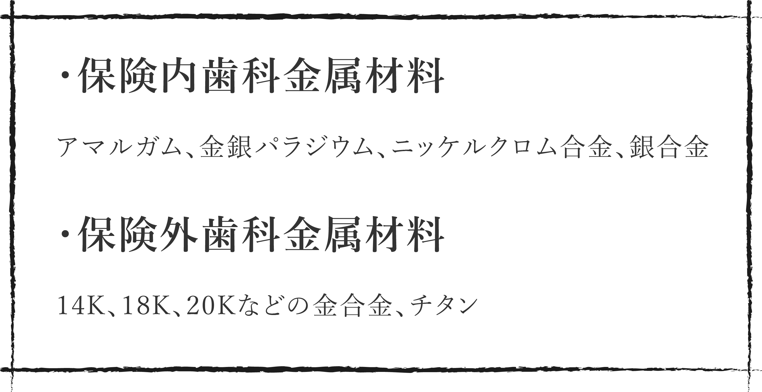 金属・歯科アレルギー専門外来では、口腔内の歯科材料と症状の関連を検討し、安全性・機能性・審美性の高い治療法を実施しています。ただし日常生活の中にも同様の成分を含んでいるものはたくさんありますので、生活を送る上で注意しなければならないこともご説明しながら治療を進めてまいります。